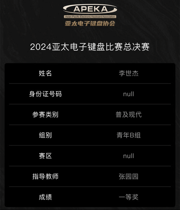 在2024年8月15日进行的2024亚太电子键盘比赛总决赛中,由我院张园园老师指导的音乐表演21-6班李世杰荣获普及现代青年B组一等奖。