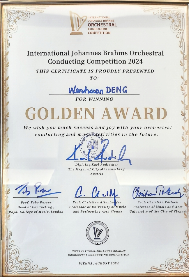 8月2日至4日,由奥地利米尔茨市政府主办的“2024勃拉姆斯国际乐团指挥比赛”在世界音乐之都维也纳成功举行。经大赛评委会评选,我院教师邓文欢荣获赛事金奖。