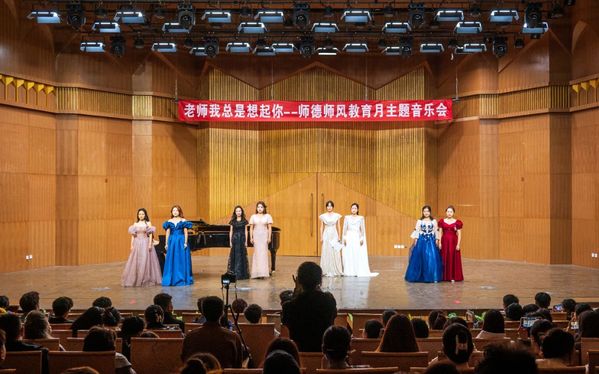 本场音乐会由我院承办,以“老师我总是想起你”为主题,节目编排上以“赞颂教师”“怀念恩师”“感恩老师”三个主题的歌曲贯穿始终,采用了独唱、合唱、表演唱等形式,为全校师生呈现了一场高标准、高质量、高审美的视听盛宴。开场节目《待风来时》,赞颂了教师梅兰竹菊般的高尚品质;《不忘初心》展现了中华民族昂扬奋进新征程的精神风貌;《手挽手》表达了华夏儿女齐心协力创造新辉煌的昂扬斗志;《感恩的心》《感恩》《奉献》《老师我想你》《老师我总是想起你》等歌曲,唱出了学生对老师的绵绵情谊;《教师颂》表达了学生对教师的崇高敬意;《长大后我就成了你》更似一团薪火,点燃了学生对教育事业的一片赤诚。13首歌曲,80余位学生的倾情演唱,赢得了现场600余位师生们的高度认可与好评。
