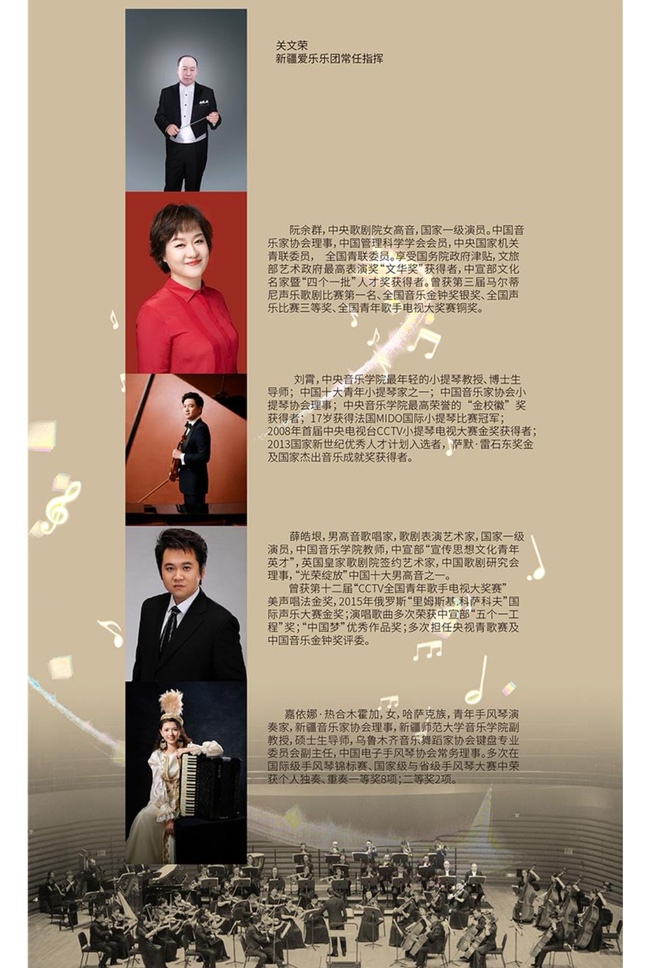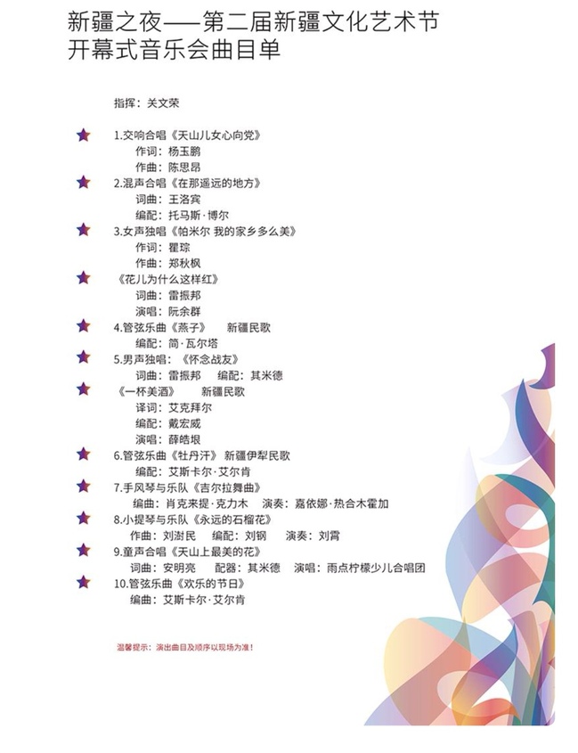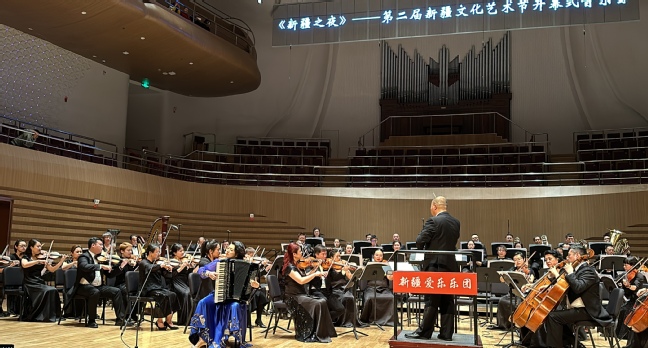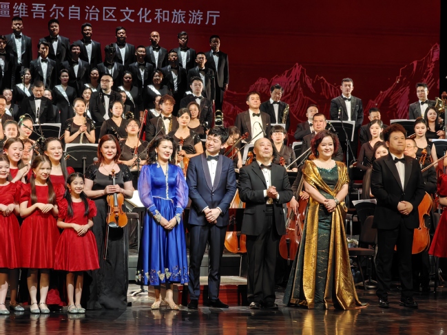 4月26日晚,以“七彩铸同心”为主题的第二届新疆文化艺术节在乌鲁木齐文化中心大剧院盛大开幕。开幕演出为新疆优秀展演剧目——交响音乐会《新疆之夜》,以经典民族音乐作品为素材的创作创新剧幕,通过交响乐的表现形式,为观众奉献了一场丰富的多元文化盛宴。
