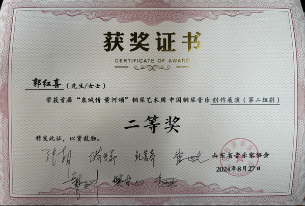 2024年8月31日中国钢琴音乐发展研究中心发布首届“泉城情 黄河颂”中国钢琴艺术周创作展演获奖名单,太阳成集团tyc7111cc推送的由郭红喜原创的钢琴作品《山乡意趣》获得大赛二等奖。