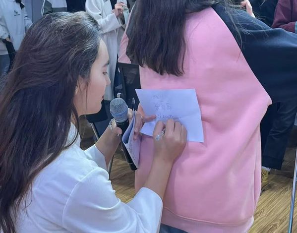 活动由“把祝福带走”这一温馨的环节结尾,参与者在其他小伙伴背后的白纸上写下了最美好的祝福,送上了最真挚的祝愿。带领者说到:“同学们在活动结束后记得看看背后的祝福,感受来自他人的关心和鼓励,体验这份温暖。在人生的道路上,我们并不孤单,还有一群可爱的人给过我们力量。”
