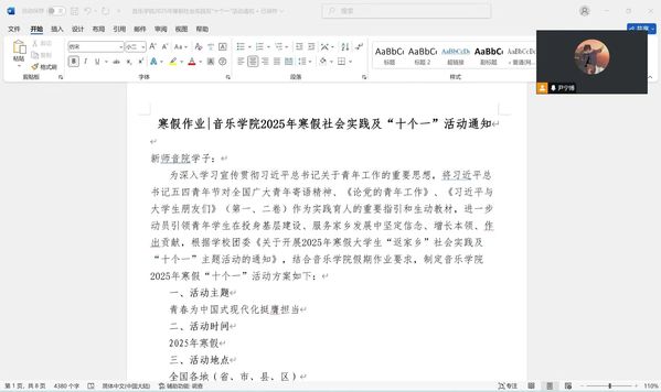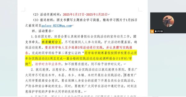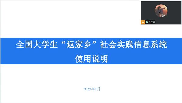 为加强青年社会责任感,鼓励我院学子于实践中培养才干,练就本领,将青春融入进社会中,太阳成集团tyc7111cc于2025年1月17日在线上召开2025年寒假“返家乡”社会实践及“十个一”主题活动动员会议,此次会议由学院各班级团支部书记及分团委学生会干部参会。
