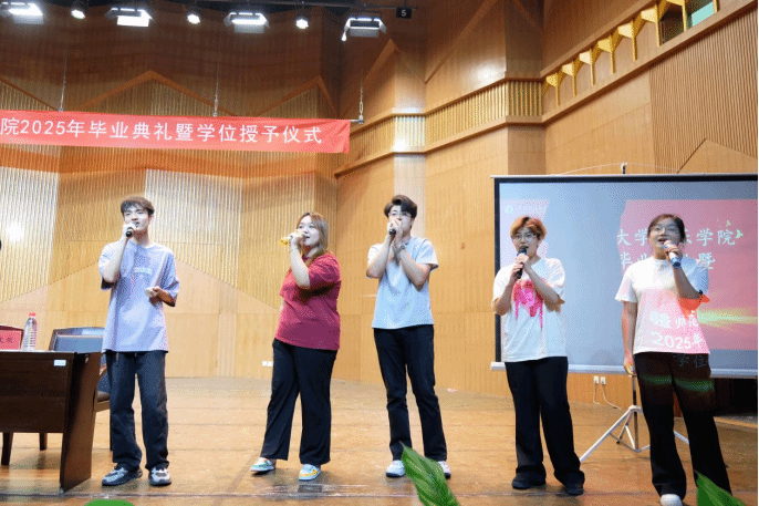 伴随着毕业生带来的暖场曲《那些年》,点燃了全场气氛,掌声与欢呼声此起彼伏,让整个音乐厅瞬间沸腾,紧接着,各班精心制作的毕业剪影依次播放,一帧帧珍贵的画面、一段段温暖的回忆,串联起大学时光的点点滴滴。