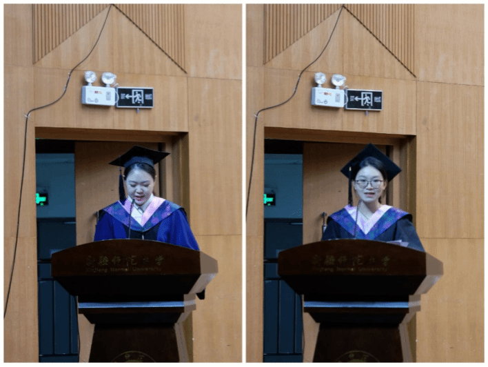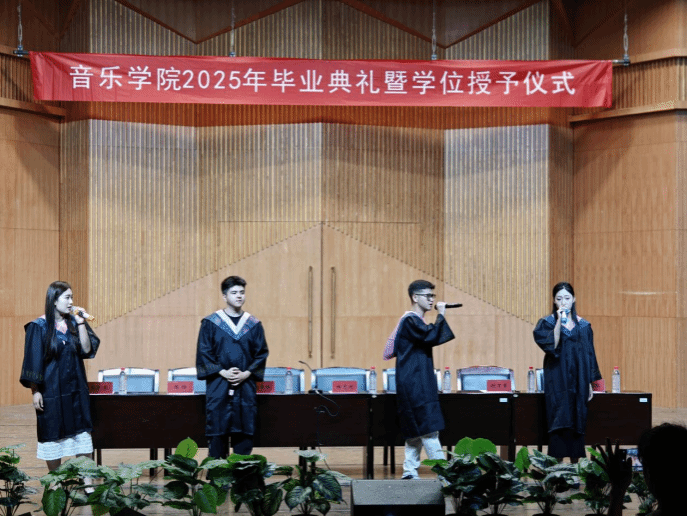 我院硕士毕业生代表音乐专业陈馨、本科优秀毕业生代表音乐学21-4班郭晨一发言。他们讲述了自己的成长经历、师生情谊,展望未来,祝福同窗携梦前行。