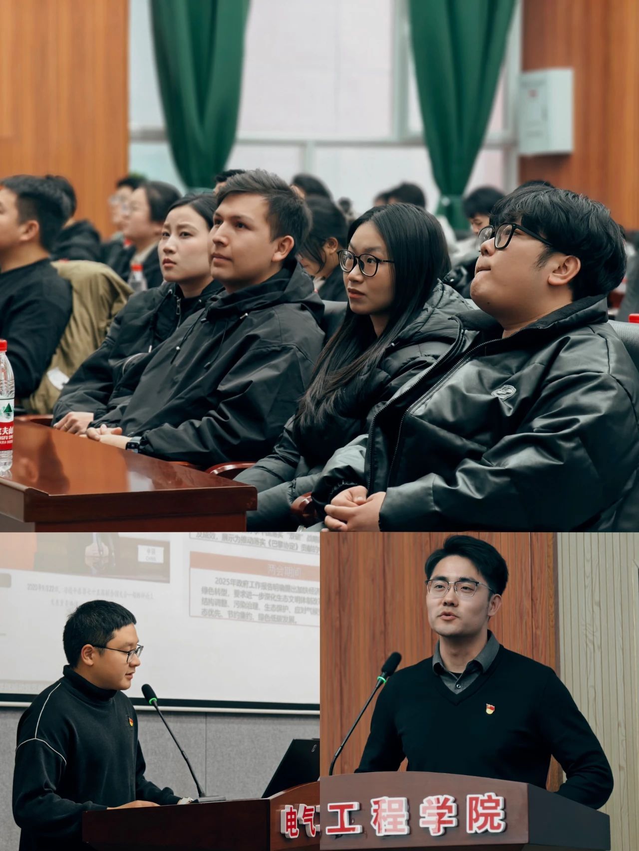 各党支部成员在电气工程学院320会议室集中进行微党课分享汇报。能源与动力工程专业本科生党支部范丙豪同学以“能动向‘新’而动”为主题进行汇报,深入阐述能源转型这一关乎人类命运的重大命题。能源转型不仅是技术革新,更是具有全球意义的战略课题,能源与动力工程专业本科生党支部将持续深化“党建+科研”工作模式,着力培养兼具专业素养、家国情怀和责任担当的新时代工科人才,为落实“双碳”战略目标和推动高质量发展注入青春动能。机械工程学院(智能制造现代产业学院)本科生第一党支部木世洵同学以“党旗指引心中路”为主题进行汇报,详细介绍了党支部建设情况、学院特色活动开展成效及支部优秀党员先进事迹。分享汇报结束后,各党支部同学们深受启发,纷纷表示要始终坚守初心使命,在学习、生活、工作中切实践行党员先锋模范带头作用。