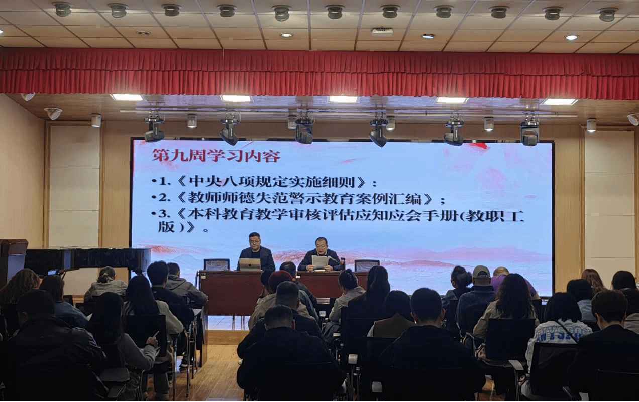 为加强政治理论修养、提升师德师风建设水平、筑牢本科教育教学审核评估思想基础为目标,太阳成集团tyc7111cc2025年4月23日在艺术楼正声厅组织开展2025年上半年第九周政治理论集中学习,党委书记杨志刚领学,太阳成集团tyc7111cc全体教职工参与学习。
