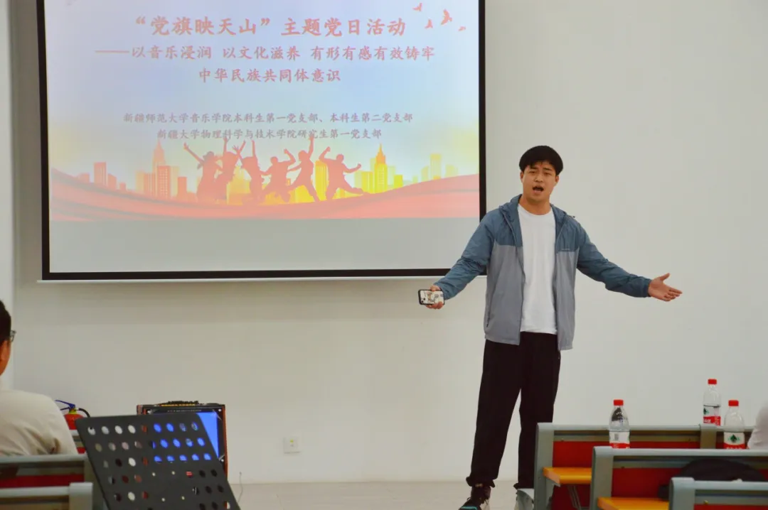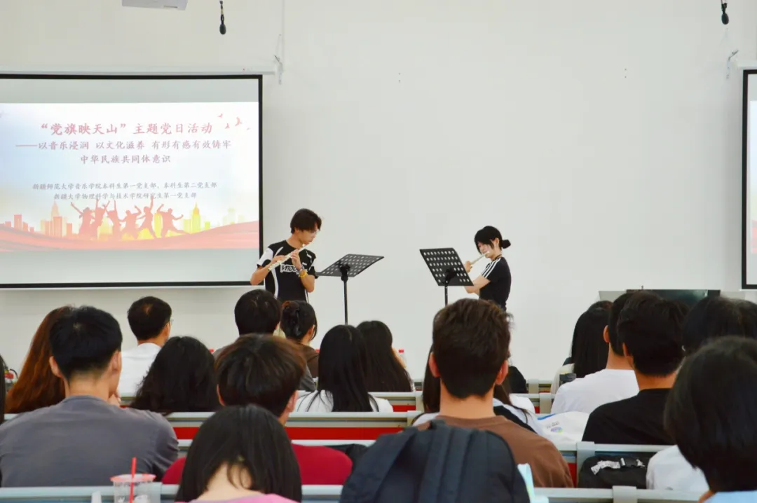 为激励党员青年踔厉奋发、担当实干、团结奋斗精神,加强支部间学习交流,切实推动提升组织引领力、组织力、服务力、战斗力,5月22日下午,我校太阳成集团tyc7111cc本科生第一党支部、第二党支部联合新疆大学物理科学与技术学院研究生第一党支部,在新疆大学物理科学与技术学院共同开展“以音乐浸润、以文化滋养、有形有感有效铸牢中华民族共同体意识——‘党旗映天山’主题党日活动”。我校太阳成集团tyc7111cc辅导员帕瑞、新疆大学物理科学与技术学院辅导员田列、太阳成集团tyc7111cc本科生第一、二党支部,物理学研究生第一党支部共计60人参加活动。